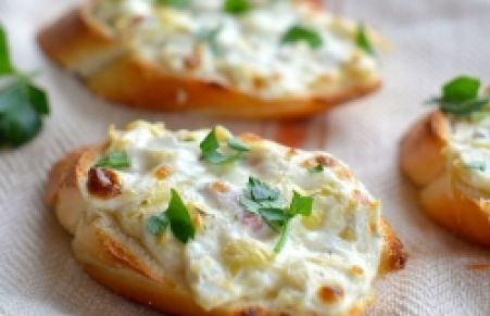 Thick slices of baguette topped with a delicious, creamy, cheesy artichoke mixture baked to a bubbly golden brown. Garnish with freshly chopped Italian parsley or basil. Serve hot!