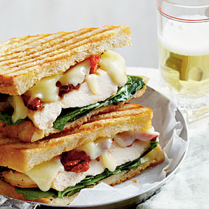 Smoky Gouda cheese, sun-dried tomatoes, and baby spinach join grilled chicken breasts in this panini that's slathered with fresh Basil Mayo.