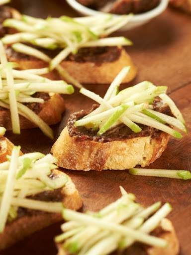 To prepare the bruschetta, spread about one tablespoon of the bacon jam on each slice of baguette. Top the bacon jam with a generous pinch of the apple slaw and serve.