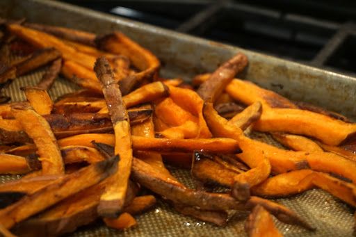Cut the sweet potatoes into sticks 1/4 to 1/2 inch wide and 3 inches long, and toss them with the oil.