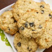 Golden brown oatmeal cookies with blueberries and a hint of cinnamon featuring a soft inside and crispy chewy outsi...