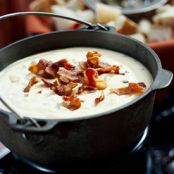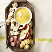 This fondue is made with medium-aged cheddar and Emmentaler Swiss cheeses, lager beer, and garlic