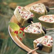 Quick and easy appetizers made from rolling cream cheese, bell peppers, olives, basil, and Parmesan, and cutting th...
