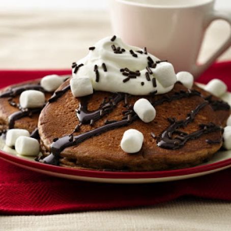 Light and fluffy chocolate pancakes are perfectly prepared on a griddle and then topped with chocolate syrup, whipp...