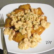 Frozen cheese filled ravioli are deep fried and topped with a creamy crawfish sauce