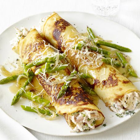 Filled store-bought crepes with shredded rotisserie chicken, ricotta cheese and herbs