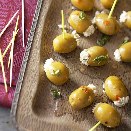 Olives are stuffed with a spicy, harissa cream cheese, then rolled in bread crumbs with freshly grated Parmigiano-R...