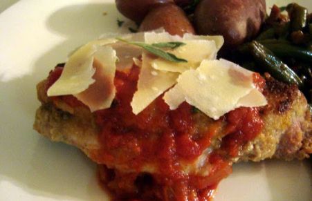 Boneless pork loin chops are stuffed with a mixture of sage, cheese and mushroons and panfried. They are topped with a marsala and tomato sauce and shaved parmesan cheese.