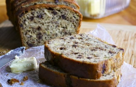 Greek yogurt makes this banana quick bread incredibly moist and offers a slight tang which complements mini chocolate chips and toasted nuts.