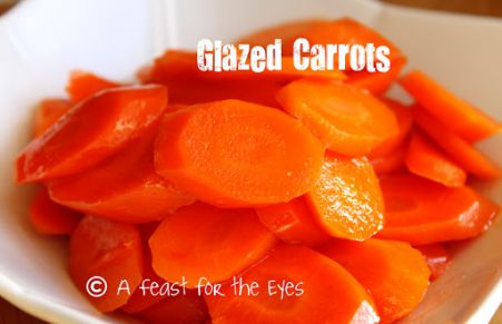 I have never liked cooked carrots-- until I made this recipe. These glazed carrots turned out a little "al dente", and glazed just enough to make these so good. Please click on the recipe source to see how I made them on my food blog, "A Feast for the Eyes".