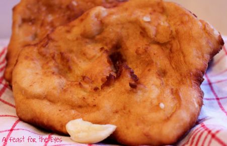 Many years ago, I took a trip to Hungary with a native of that country. That's when I first experienced Lángos Bread. Think of them as a fried bread, with a tender texture of a doughnut inside. Later, I used to make a two-hour pilgrimage to a restaurant in San Francisco just to order theyHungary Gulyas soup (made with paprika in a rich tomato-beef broth) and hot Lángos, that was freshly rubbed with garlic. I couldn't get enough of them. Sadly, the restaurant went out of business. I was recently given a cookbook on Hungarian recipes, and there was a recipe for Lángos. I had to adapt it to US measurements, tweak a few things, but it turned out really well. These are best served hot and fresh. Other ways to serve them (which I've never tried, as I love garlic) is with sour cream and grated cheese. They're quite simple to make, and would impress your lunch or dinner guests along with a heart soup or stew. This was my first time making this bread, and the flavor and tender texture was exactly as I remembered. Yay!