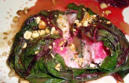 Sea-bass filets are stuffed with a mixture of boursin cheese and crabmeat, wrapped in swiss chard leaves and roasted. They are topped with a pomegranate-hazelnut vinaigrette.