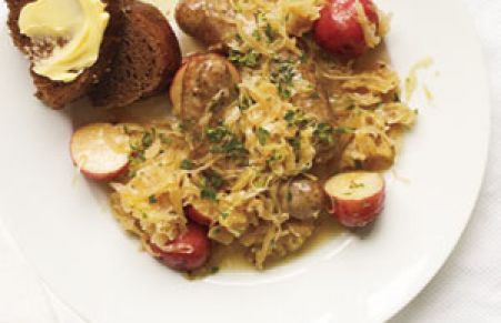 German comfort food at its finest! Bratwursts simmered in white wine with potatoes, sauerkraut, flavored with caraway seeds and served with hearty dark bread.