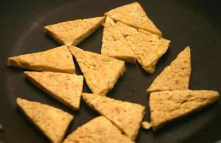 Place your tofu in the pan leaving room around pieces. You may need to fry a few batches to give it enough room. As the tofu cooks, use a spatula to frequently press down on each piece. You will see the water seeping out and sizzling in the pan. Once the bottom sides are very firm and golden in color, flip the tofu pieces and fry the other side, again frequently pressing each piece with a spatula. When they are golden and firm on both sides, they are done.