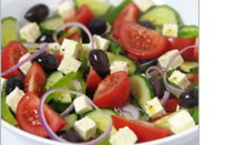 Greek salad, or horiatiki salata, is a rough country salad of juicy tomatoes, crisp cucumber, sliced red onion, green pepper, crumbly feta cheese and plump kalamata olives. Greek salad can be served as a side dish or as a light meal with some crusty bread.