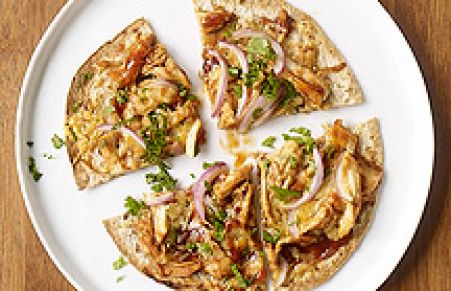 These weight watcher friendly baked pizzas feature wheat tortillas topped with BBQ sauce, shredded chicken, melted gouda cheese and onions.