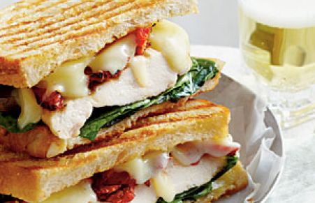 Smoky Gouda cheese, sun-dried tomatoes, and baby spinach join grilled chicken breasts in this panini that's slathered with fresh Basil Mayo.