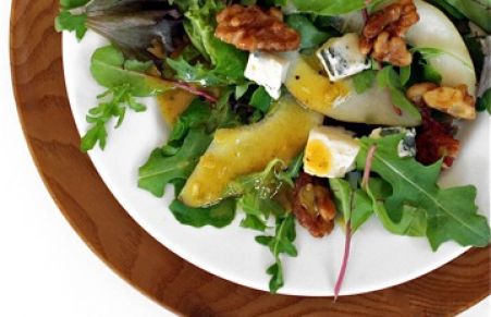 Holiday salad featuring healthy greens, toasted walnuts, onions, blue cheese, raisins, apples, pears, bacon and vinaigrette.