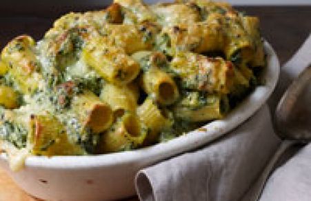 A quick and easy version on spinach and ricotta cannelloni. This baked pasta is made easy because there's nothing to stuff. Simply tossing the filling with the cooked rigatoni, then topping with fontina will have dinner on the table in no time at all. Absolutely delicious!