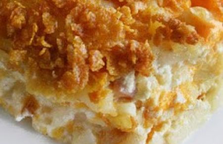 Baked has browns with cream of onion, chicken soup, sour cream and cheddar cheese. A real crowd pleaser everyone will enjoy!