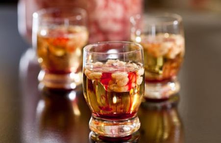 These spine-tingling shooters may look like a science experiment gone wrong, but the Bailey’s and grenadine“brains”go down smoothly (with a little strawberry vodka to help them along).
