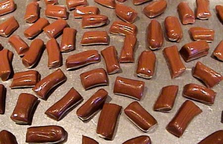 How would you react if your dentist suddenly whipped out a giant Tootsie Roll for you to bite down on so that he could make a mold of your teeth? Ask patients of a dentist in Philadelphia who does just that. This is just one of the many facts that you learn researching the history of the Tootsie Roll, Which, by the way, was named after the inventors five-year-old daughter. Leo Herschfield created the chewy chocolate candy in his small store in New York in 1896. In those days, the candy was hand rolled and delivered to customers by hore-drawn carriage. Over one hundred years later, more than forty-nine million Tootsie Rolls in a variety of sizes are produced each day from operations all over the world. Even though this clone recipe duplicates the tiny bite-size versions of the candy, you're free to make yours any size you like. The technique here is a tweaking of the previous secret formula that was featured in Low-Fat Top Secret Recipes, and it includes several upgrades. I found that more cocoa, plus the addition of salt and butter to the mix improve the flavor quite a bit. I also found that brining your sweet bubbling mixture to the firm ball stage 250 degrees F - yes, you're going to need a candy thermometer for this, and then stretching and pulling the candy like taffy fun! As it cools, will give you a finished product more like the real deal.