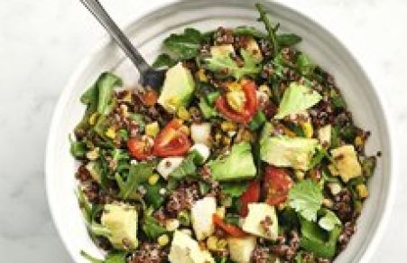 Hearty red quinoa instead of taco meat, arugula instead of watery lettuce, and a healthy serving of avocado and tomato salsa. You’ll be addicted to the chipotle lime dressing, great for veggie dip or on salads.