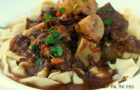 It's been years since I've had Beef Burgundy (otherwise known as Boeuf Bourguignon--a Julia Child specialty). As I was preparing all the components to make this in my slow cooker, I realized I didn't have 8 hours to simmer this. Plus, I do NOT like adding raw meat in a slow cooker, because I know that the best flavor is built by taking the time to sear the meat. All that brown "stuff" at the bottom of the pot is loaded with flavor. Typically, you need to allow 2-3 hours to to simmer in the oven. Then it hit me. Use my pressure cooker! I won't lie-- the prep time for this is about an hour, because you need to build the tasty components-- cook the bacon, brown the small onions until golden and glazed, brown the mushrooms until golden and brown the meat. From there, it was easy, because this French stew was ready in 40 minutes! The meat was butter tender, and the Burgundy wine rich sauce was delicious. I served this over homemade egg noodles, but boiled potatoes are most traditional. Don't have a pressure cooker? You are so missing out on of the most feared kitchen tools, that doesn't have to be. I will show you how I made this step-by-step on my blog. You can certainly adapt to cooking this in the slow cooker for a few hours, or in the oven. No matter how you prepare it, be prepared for a delicious French stew that is perfect for entertaining-- and it tastes better the next day.
