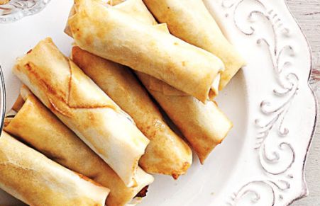 East meets West in these tasty little bites. We've doubled up on the spring roll wrappers, which provides extra crunch and prevents the filling from bursting out. Processed cheese may seem like a strange choice, but it adds a creamy texture and the signature cheeseburger taste. Serve the rolls warm, with ketchup and mustard for dipping
