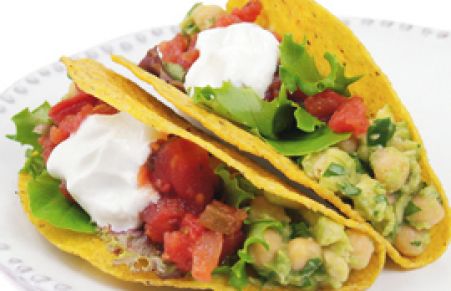 Turns out, tacos don’t have to be hot to be delicious. The chickpea-avocado mash used as a filling here is prepared and served at room temperature. (It makes a great sandwich spread as well.) Because the fat content of taco shells can vary, look for brands that contain approximately 6 grams or fewer per shell.