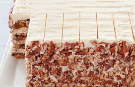Shred the carrots on the large holes of a box grater or in a food processor fitted with the shredding disk. Do not substitute liquid buttermilk for the buttermilk powder. To ensure the proper spreading consistency for the frosting,use cold cream cheese. If your baked cake is of an uneven thickness,adjust the orientation of the layers as they are stacked to produce a level cake. Assembling this cake on a cardboard cake round trimmed to a 6 by 8-inch rectangle makes it easy to press the pecans onto the sides of the frosted cake.