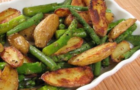 Get your veggies and potatoes in this one dish. The roasted potatoes tossed with the asparagus and green beans near the end of the roasting time, so that the vegetables remain crisp.