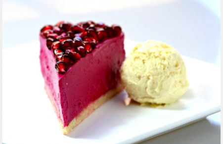 A vegan pomegranate cheesecake made from cashews, agave syrup, and coconut oil, flavored with vanilla, lemon and beet juices, with clementine gelato.