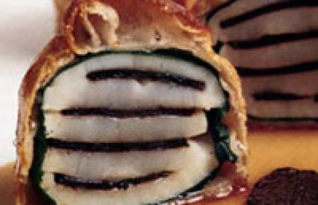 It’s a harmonious combination of layered big, succulent sea scallops and dark diamonds of Perigord — black truffles — both of which are encased in spinach and puff pastry. It can be assembled up to 4 hours in advance, refrigerated, then baked, and its sauce prepared 10 minutes before serving.