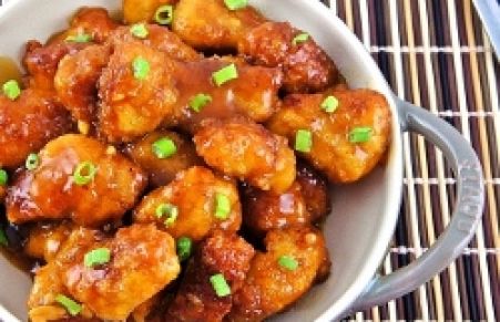 Chicken lightly breaded and fried covered in sweet, tangy, garlicky orange sauce. Green onions give a little color to this easy and tasty dinner.