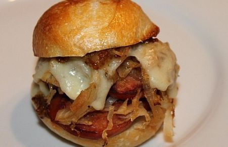 Kielbasa Sandwiches with Grilled Sweet Onions, Sauerkraut, Melted Cheese & Mustard Jalapeno Spread