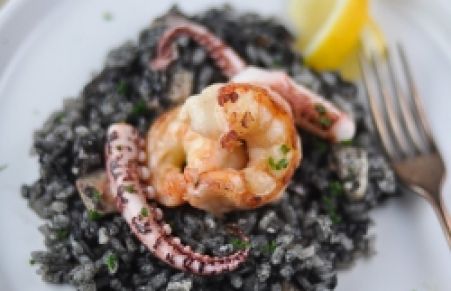 Paella Negra aka Arròs negre is a Valencian and Catalan dish made with squid and rice, somewhat similar to seafood paella.