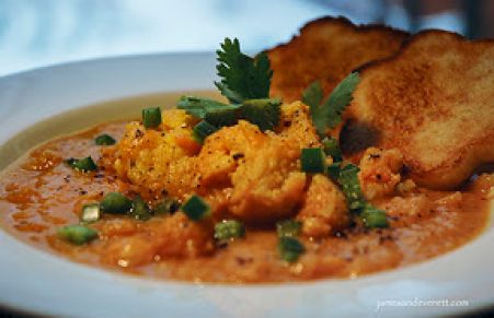 Cauliflower roasted with Indian spices mingle with the sweetness of yams to create this healthy and delicious soup.