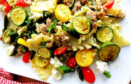 Lasagnetti with Crumbled Sausage, Asparagus and Zucchini Coins