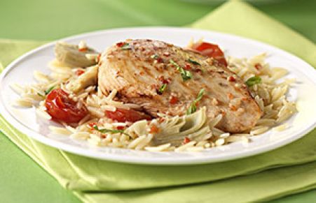 Ready for a new weeknight favorite? How about zesty chicken and orzo with artichoke hearts and cherry tomatoes cooked lightning fast in a skillet?