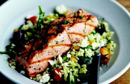 Grilled Salmon with Orzo, Feta, and Red Wine Vinaigrette