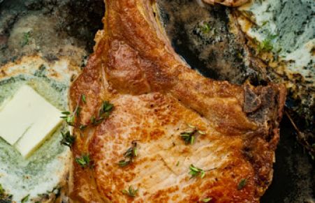 For perfectly tender and juicy restaurant-style pork chops, sear them over high heat, finish cooking in the oven, then baste with brown butter, thyme, and garlic.