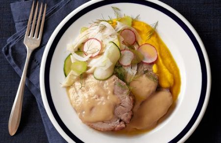 Find all the pictures we have received for this Buttermilk Braised Pork Shoulder With Carrot Purée & Shaved Fennel, Radish & Cucumber recipe.