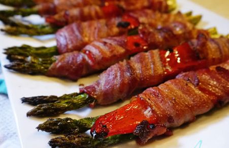 Tender young asparagus stalks and bright red sweet peppers are wrapped in hickory smoked bacon, drizzled in olive oil and baked until crisp and juicy!