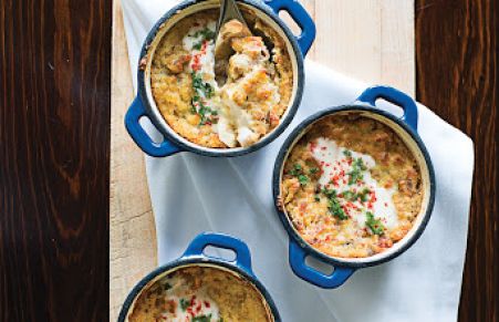 Delicious individual spoon puddings baked with savory Italian sausage, cornmeal, egg whites, cheese, topped with tart crème fraîche, Aleppo pepper and parsley.