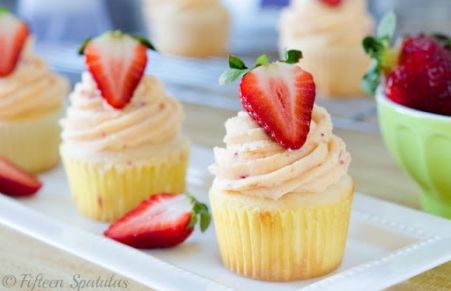 Impress your guests with this knock-out dessert; fresh strawberry buttercream cupcakes. Top with a fresh strawberry on top.