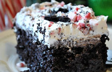 Rich chocolate peppermint cake moistened with sweetened condensed milk, smothered in whipped cream, and topped with candy cane bits.