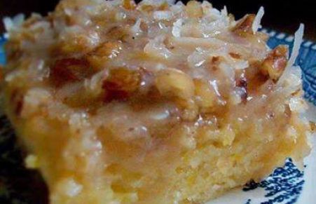 Peach, coconuts and nuts make this cake a light and airy dessert everyone will enjoy.