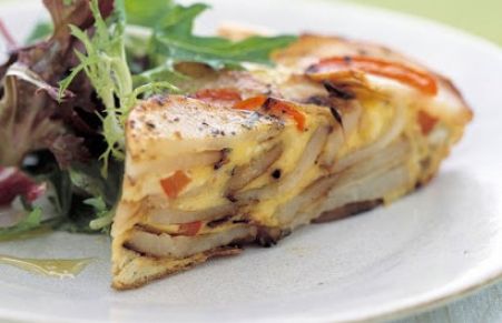 This dish is based on tortilla Espanola. In Spain, it is traditionally accompanied by garlic mayonnaise but it is also delicious served on its own. You can use leftover boiled or baked potatoes in place of the raw ones. Simply slice them, and add to the onion mixture at the end of step 2.