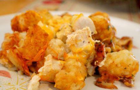 All of your families favorite ingredients in one meal - ranch dressing, tater tots, bacon and chicken -- and some healthy veggies mixed in! Serve with a side salad.
